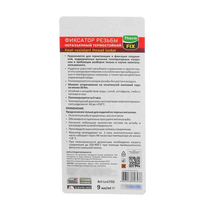 Средство для герметизации и фиксации резьбовых соединений, подверженных высоким температурным нагрузкам и требующих разборки только в случае капитального ремонта. Препятствует саморазвинчиванию деталей при вибрационных и температурных нагрузках.