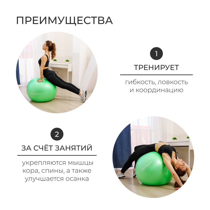Гимнастический мяч предназначен для домашнего фитнеса. Занятия с таким снарядом тренируют координацию, ловкость, гибкость. Также его используют при выполнении упражнений для спины и пресса.