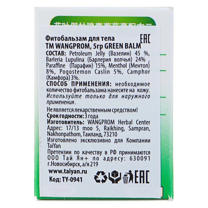 Состав: petroleum jelly (вазелин) 45%, barleria lupulina (барлерия волчья) 24%, paraffine (парафин) 15%, menthol (ментол) 8%, pogostemon caslin 5%, camphor (камфора) 3%.