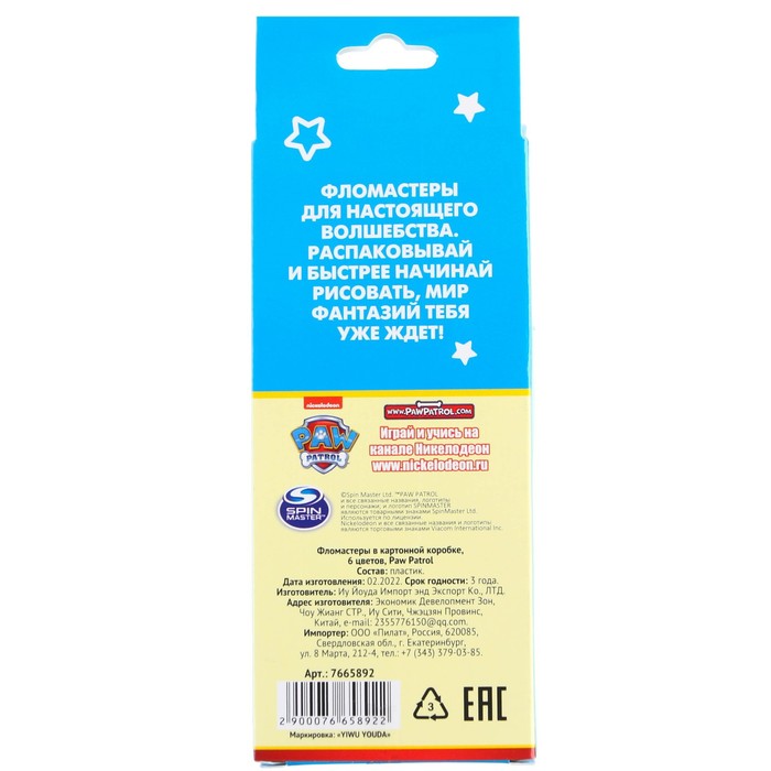 Фломастеры, 6 цветов, в картонной коробке, Paw Patrol