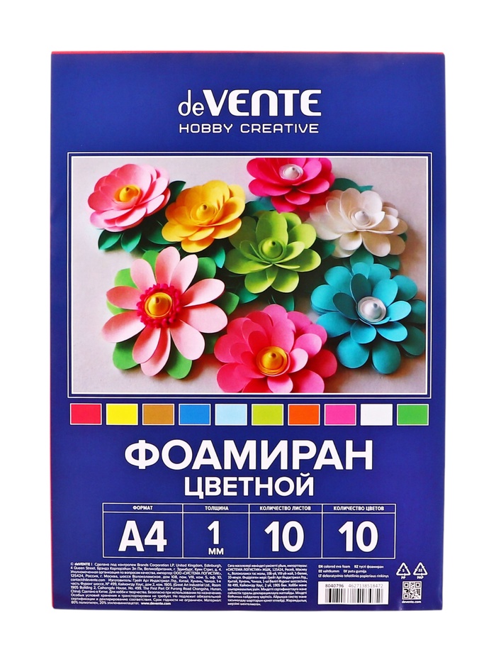 Фоамиран цветной A4 deVENTE 10 цветов, 10 листов, толщина 1 мм, пластиковый пакет с европодвесом.