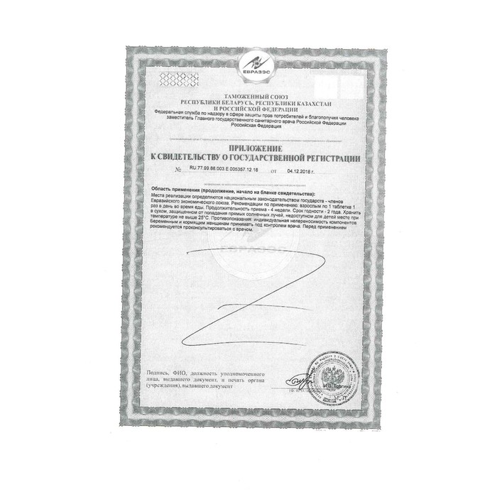 Способ применения: взрослым по 1 таблетке в день во время еды, обильно запивая водой. Продолжительность приема – 1 месяц. При необходимости прием можно повторить.