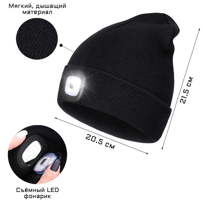 Теплая и удобная шапка оснащена съемными четырьмя LED — фонариками, что делает ее идеальным выбором для активного отдыха в условиях низкой освещенности. Благодаря этому аксессуару вы можете выполнять любые задачи даже в полной темноте, оставаясь при этом хорошо заметными на улицах и дорогах.