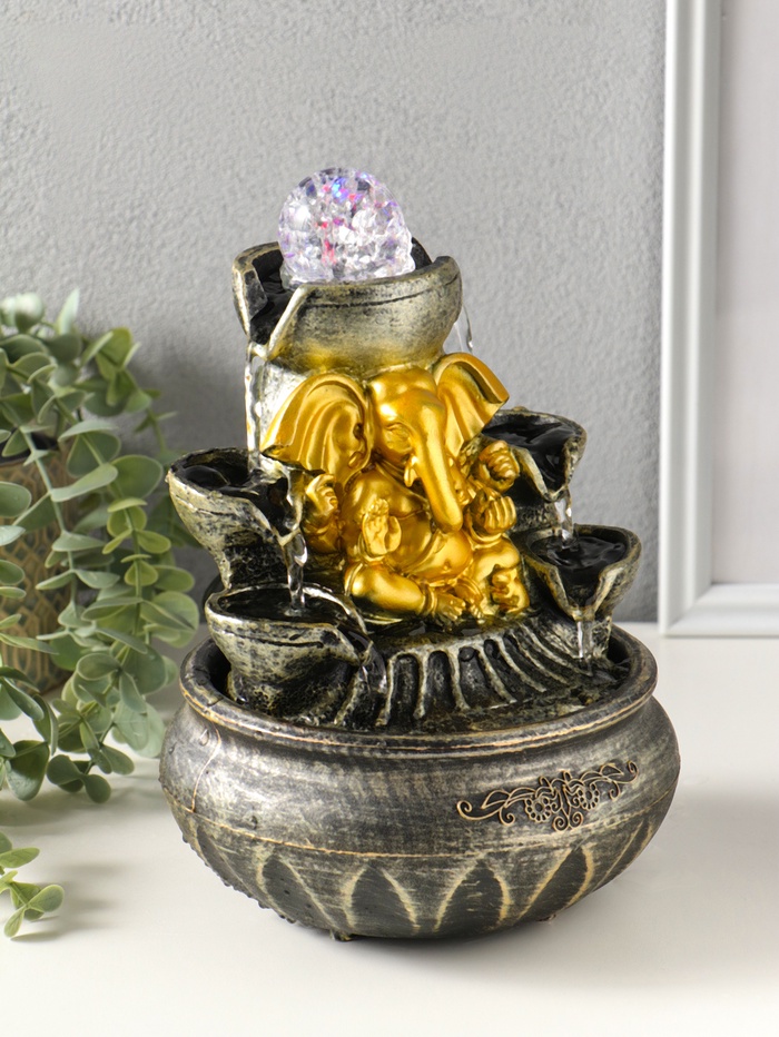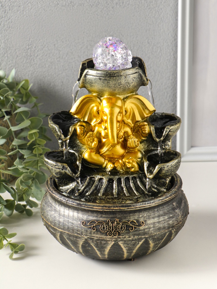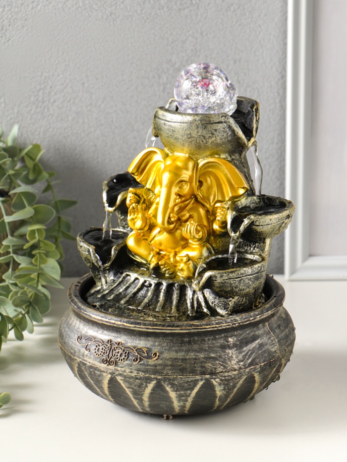 Этот настольный фонтан с Ганешей создаёт в комнате атмосферу умиротворения и гармонии. Мягкое журчание воды успокаивает мысли, а тёплая подсветка превращает его в источник живого, мерцающего света. Компактный размер делает его идеальным акцентом для рабочего стола, зоны медитации или прикроватной тумбочки.