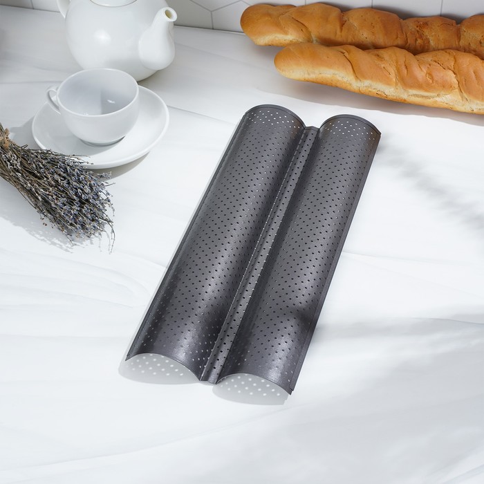 Для выпечки ровных аппетитных багетов можно использовать обычный противень, но для ускорения работы лучше купить специальный - форму для выпечки багетов Доляна. С помощью формы для выпечки багетов очень легко приготовить ровные по форме изделия, равномерно пропеченные и аппетитно поджаренные со всех сторон. Высококачественная листовая сталь равномерно распределяет тепло - для идеального результата. Он снабжен антипригарным покрытием, поэтому ничего не прилипает. Вы можете испечь до двух багетов одновременно. Такой удобный и практичный аксессуар станет незаменимым помощником на кухне для каждой современной хозяйки.