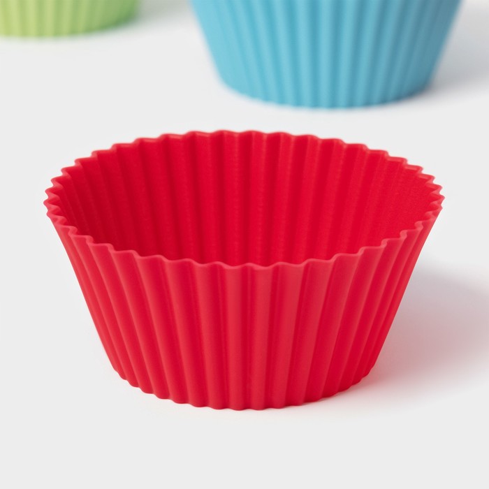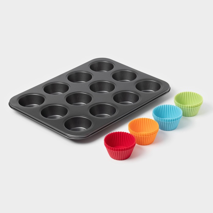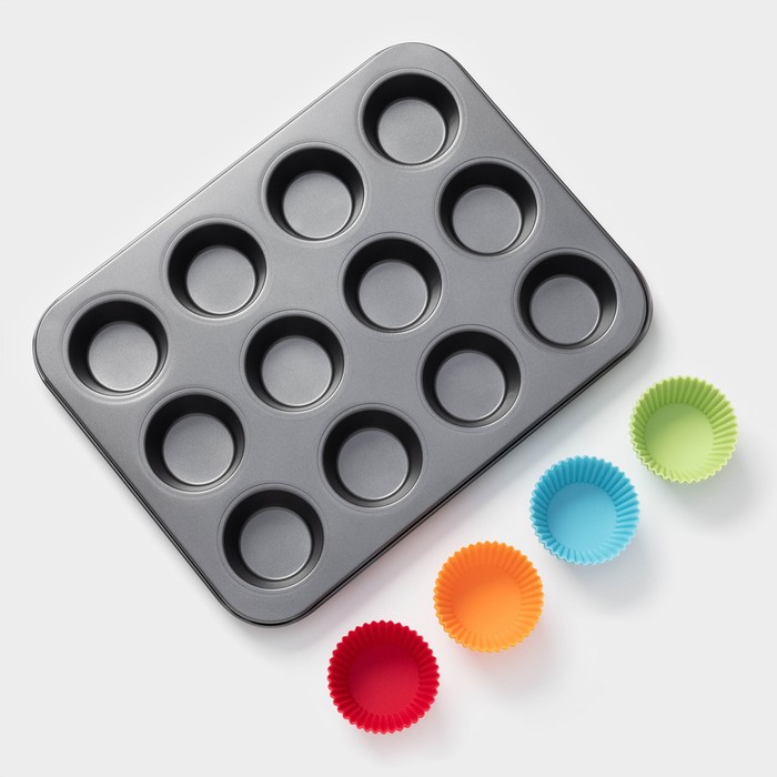 Форма для выпечки Доляна «Силикон плюс», 35×26,5×2,5 см, 12 ячеек, силиконовые вкладки, антипригарное покрытие, цвет формочек МИКС