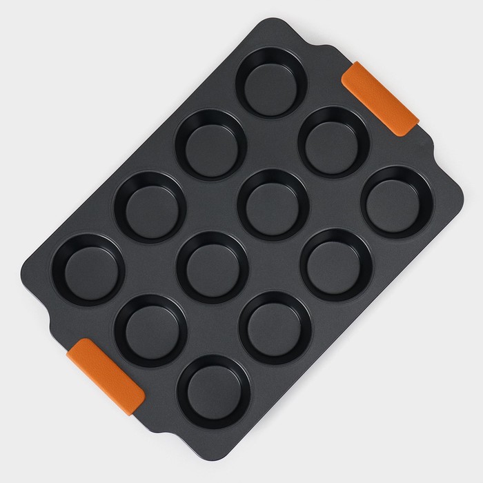 Форма для выпечки изготовлена из высококачественной углеродистой стали с внутренним антипригарным покрытием, что позволяет выпекать без использования масла или жира. Форма имеет круглую форму с 12 круглыми ячейками, что идеально подходит для выпечки небольших кексов, маффинов, печенья и других кондитерских изделий.