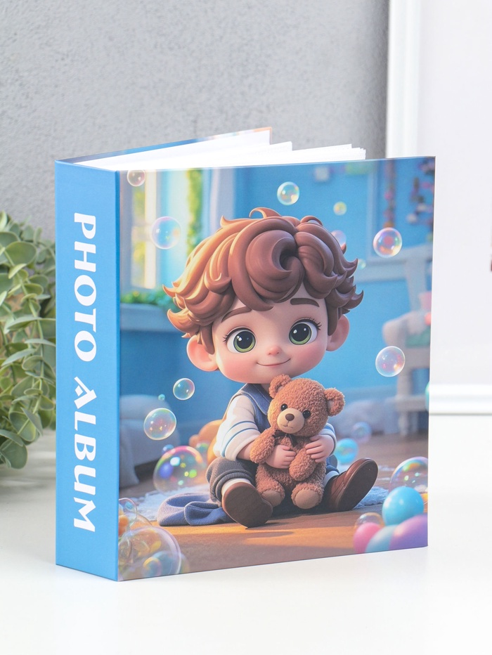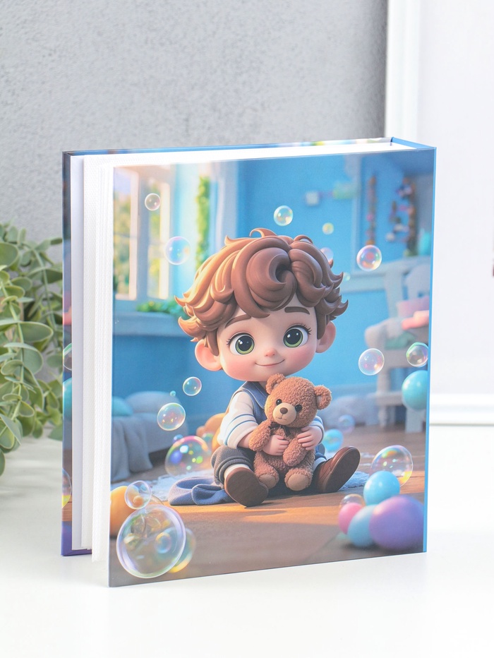 Фотоальбом на 80 фото 10х15 см "Мальчик с мишкой и пузырьки" в коробке 5х19х22,8 см