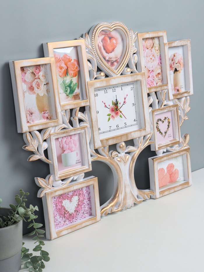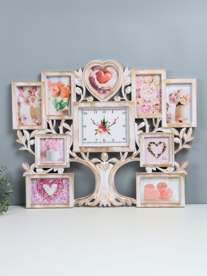 Настенные часы с фоторамками - оригинальный подарок, который никого не оставит равнодушным. Эти часы настоящая находка для тех, кто ценит качество и неповторимый дизайн. Настенные часы - это не только функциональный предмет, но и настоящий декоративный аксессуар, они разнообразят интерьер любой спальни или гостиной, подчеркнут стиль и гармонию вашего дома. Вместе с часами идут 9 рамок для фотографий, сделайте подборку из лучших и любимых фотографий, которые будут напоминать вам о каком-то приятном моменте вашей жизни.