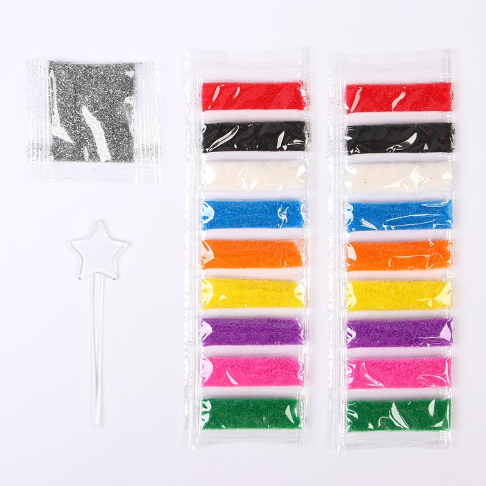 Фреска из песка — увлекательный вид творчества, который понравится любому малышу. Ведь раскрашивать любимых героев с помощью цветных песчинок так здорово! Засыпайте картинку постепенно и не забывайте равномерно распределять мелкие блёстки по клеевому слою, чтобы картина сияла. Или засыпьте только некоторые части фрески, придав картинке фактуру. Специальные контуры не дадут разноцветным частичкам перемешаться и помогут создать сверкающий шедевр. Клеевая основа защищена специальным слоем бумаги с прорезями. Отделяйте верхний цветной слой с помощью стеки и засыпайте песком подходящего оттенка.