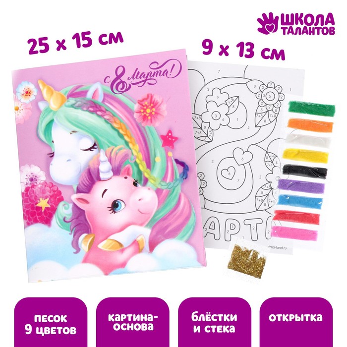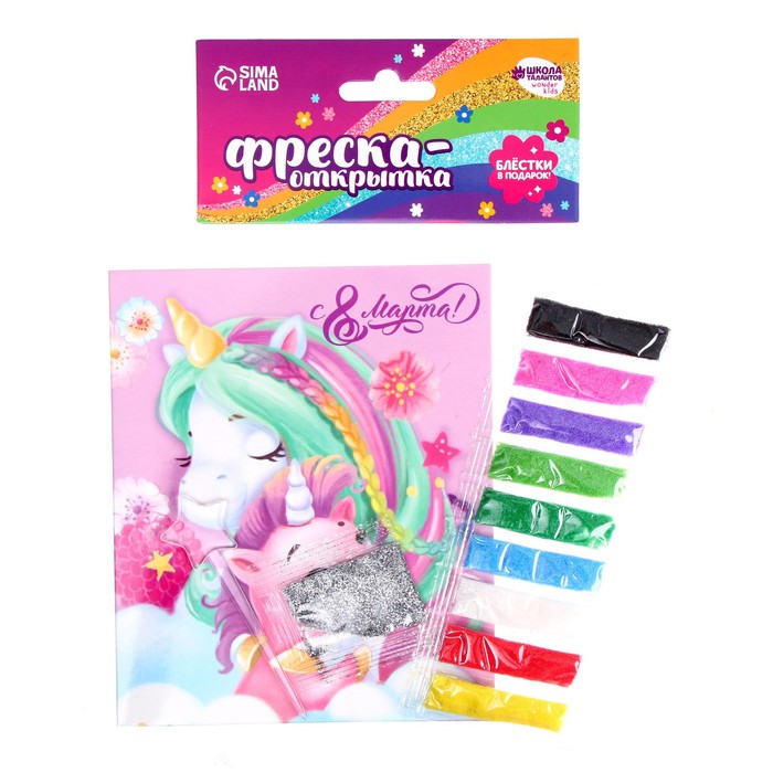 Создание фресок — увлекательный вид творчества, который понравится каждому ребёнку. Клеевая основа защищена специальным слоем бумаги, куда нанесены прорезные контуры. Каждый цвет находится в своей зоне: отделяйте верхний слой с помощью стеки, оформляйте элементы песком и добавляйте блёстки согласно инструкции из набора.