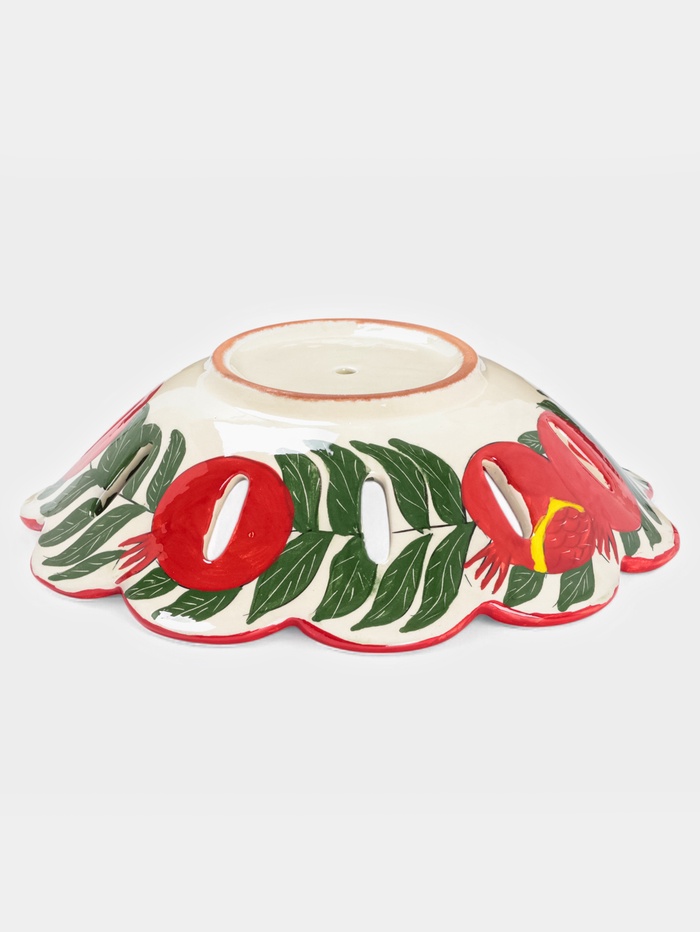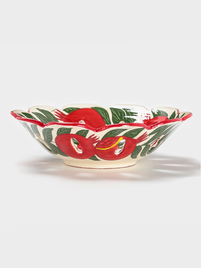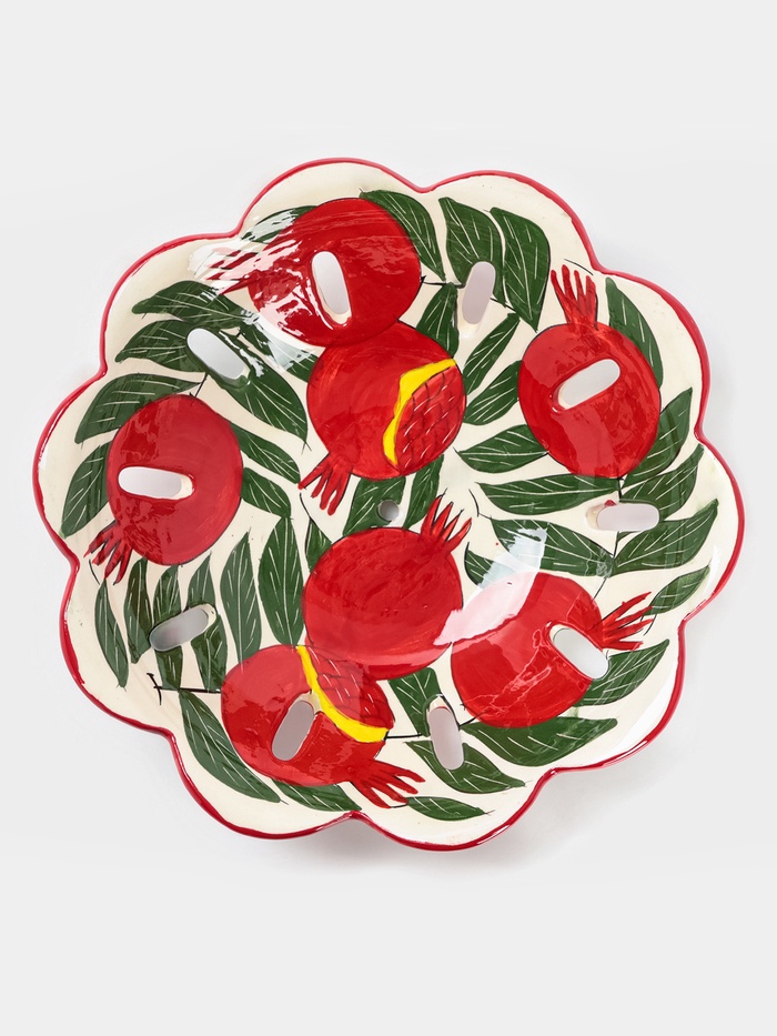 Фруктовница «Шафран» от Риштанской керамики — это идеальное сочетание традиций и современного дизайна. Изготовленная вручную, она привнесет в ваш дом уют и элегантность. Бело-красная цветовая гамма с фруктовым орнаментом делает её ярким акцентом на любом столе.