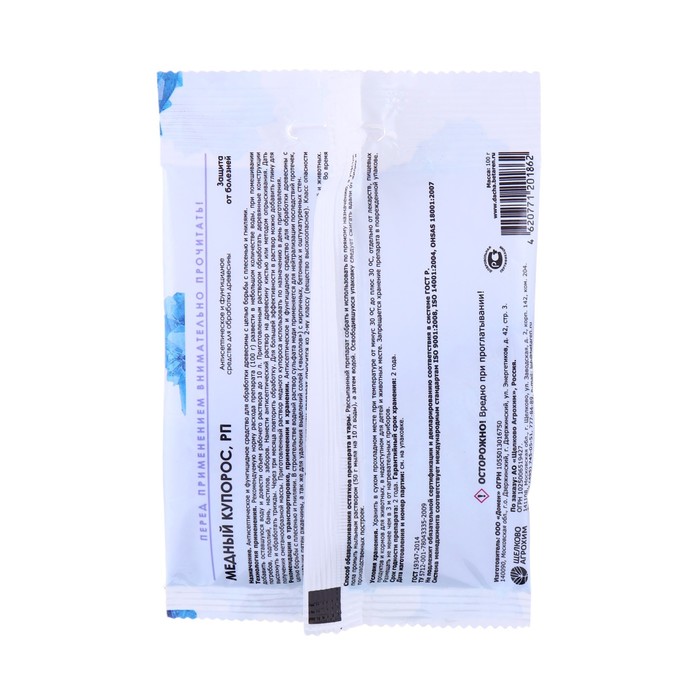Применение: Обработка от плесени: содержимое пакета (100 г) медного купороса развести в небольшом количестве (1–1,5 л) теплой воды, при помешивании добавить воду, доведя объем раствора до 10 л. Приготовленным раствором обработать деревянные конструкции погребов, подполий, бань, настилов, заборов, теплиц и др. Наносить раствор на древесину кистью или опрыскивателем. После высыхания обработку повторить еще дважды. Через три месяца повторить обработку еще раз. Для удаления плесени с поверхности кирпичных, бетонных, оштукатуренных стен качественно зачистить пораженный участок (удалить обои с поврежденных поверхностей, убрать со стены пораженную штукатурку), чтобы избавиться от невидимых глазу очагов поражения. Раствором медного купороса обработать ту зону, где была плесень. Дать просохнуть, затем нанести средство еще раз. Повторять процедуру можно до 5 раз.