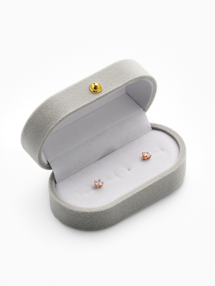 Размеры 7,5×4×3 см идеально подходят для размещения серег или кольца, создавая безопасное и удобное пространство для хранения украшений. Серый цвет футляра добавляет ему универсальности и лаконичности, а белая вставка внутри подчеркивает изысканность содержимого, создавая контраст и акцент на украшении.