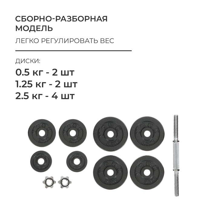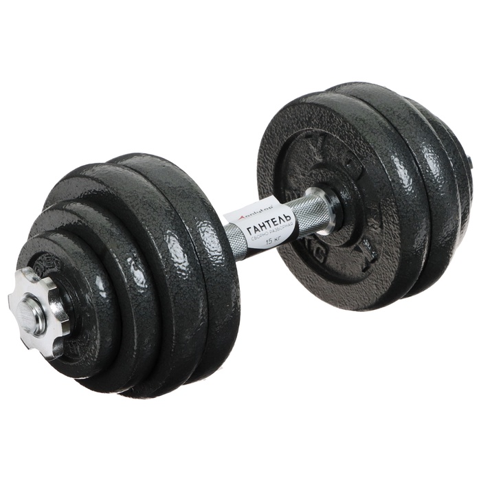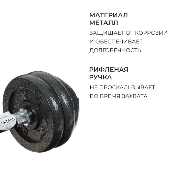 Гантель подходит для тренировок в спортивном зале и дома. Рифлёная ручка не проскальзывает во время захвата. Установленные по краям держатели надёжно фиксируют надетые диски.