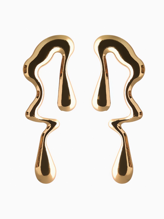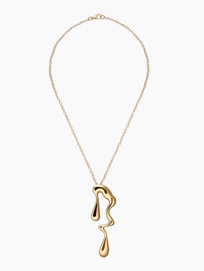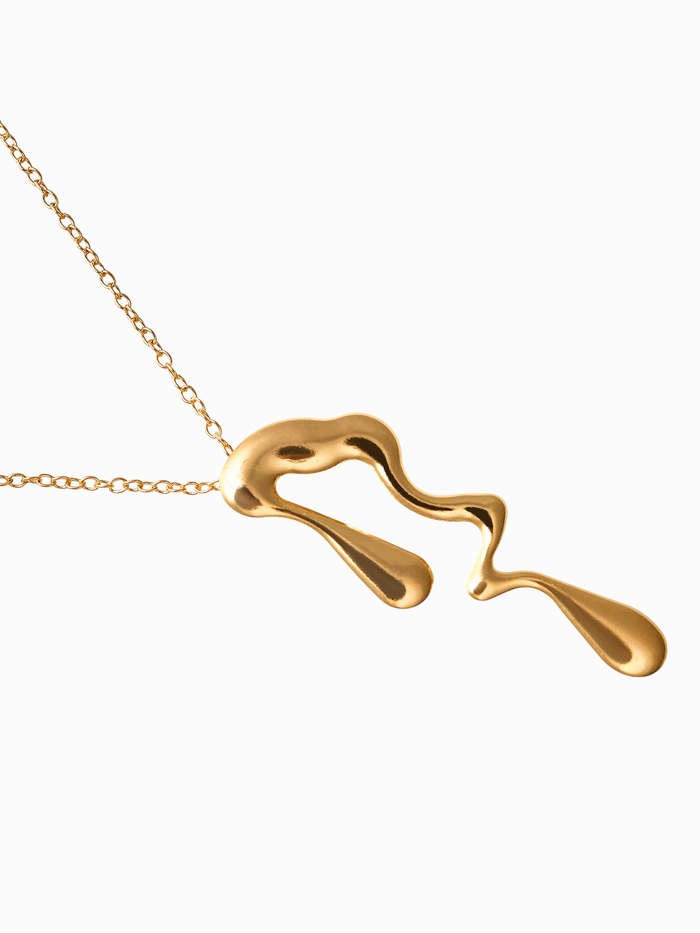 Изящный гарнитур из двух предметов — кулона и серёг — воплощает в себе лёгкость и плавность форм, напоминающих капли, которые медленно тают на солнце. Золотистый оттенок украшений подчёркивает тепло и благородство образа, создавая атмосферу утончённой элегантности и современного стиля.