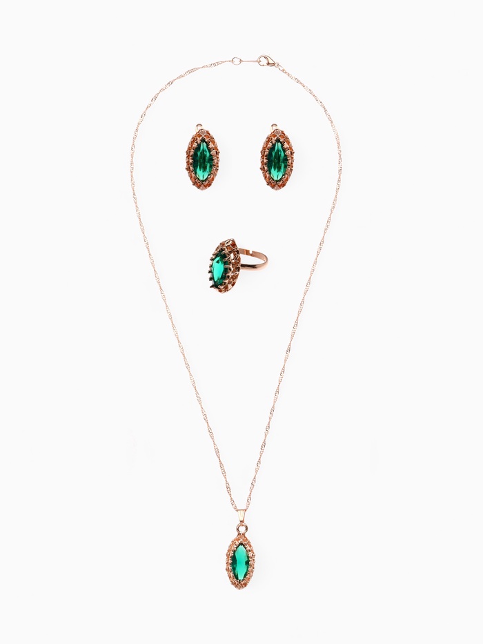 Гарнитур 3 предмета: серьги, кулон, кольцо безмерное «Эдель» овал вытянутый, цвет зелёный в золоте, 45 см