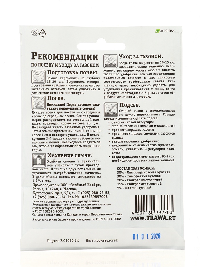 - Компактный формат для малых площадей: одного пакета весом 30 г достаточно для засева 1 квадратного метра. Это идеальный объем для пробного посева, ремонта проплешин или создания маленького газончика на солнечном месте.