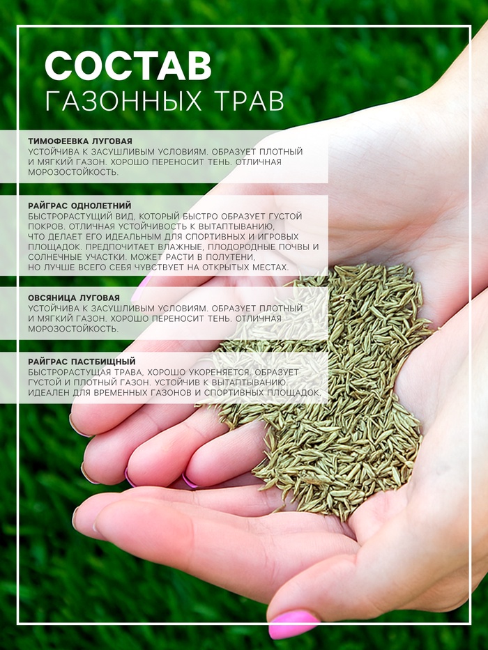 Состав: райграс пастбищный - 50%, тимофеевка луговая - 20%, овсяница луговая - 20%, райграс однолетний - 10%.