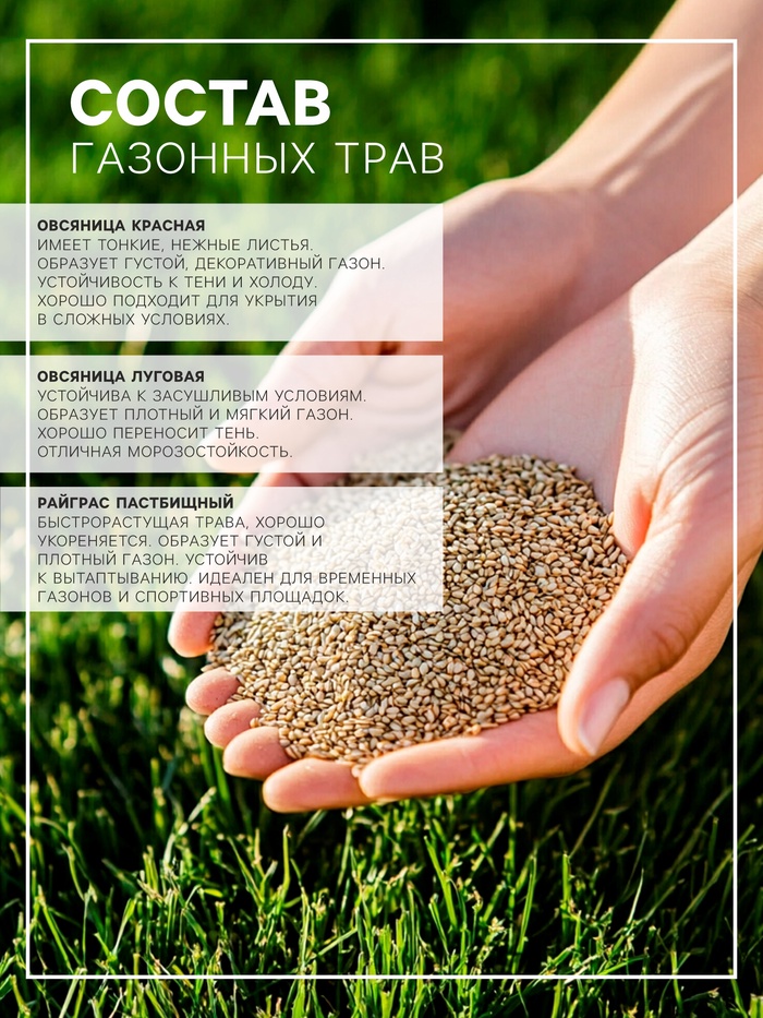 - Экономичная фасовка: 1 кг смеси хватает на 30–40 м². Семена чистые, без сорных примесей — всхожесть сохраняется до конца срока годности.