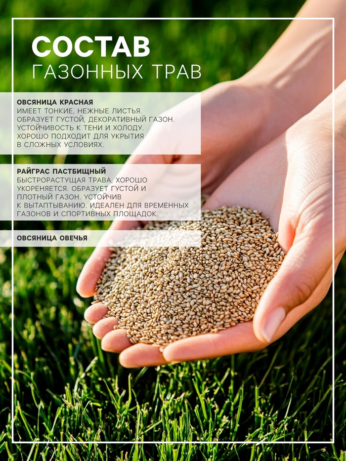 Семена газонной травосмеси. Норма высева 4 кг на 100 кв.м. Глубина заделки семян 1 см.