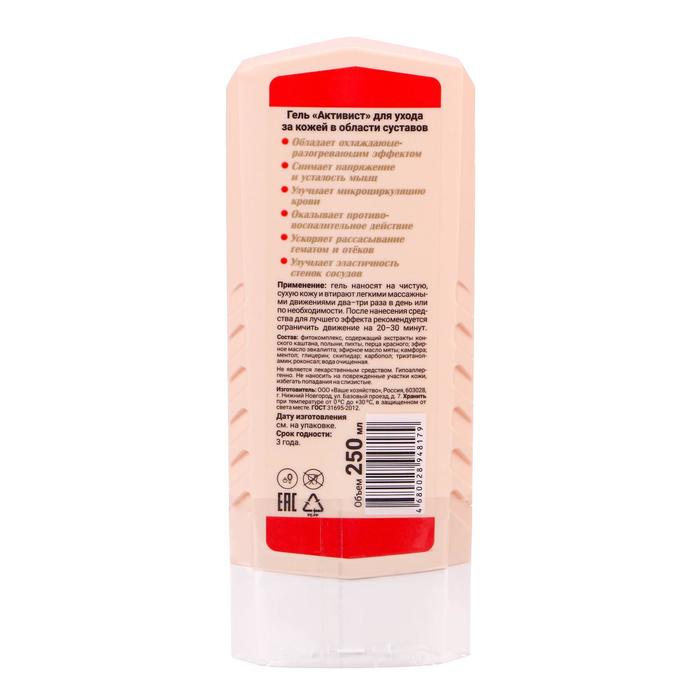Гель «Активист» - обладает охлаждающе-разогревающим эффектом, снимает напряжение и усталость мышц, улучшает микроциркуляцию крови, оказывает противовоспалительное действие, ускоряет рассасывание гематом и отёков, улучшает эластичность стенок сосудов.