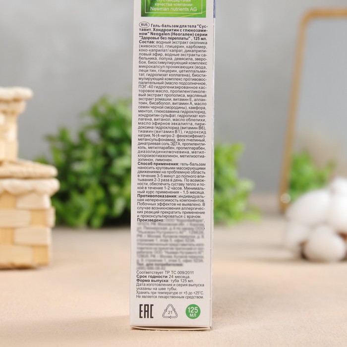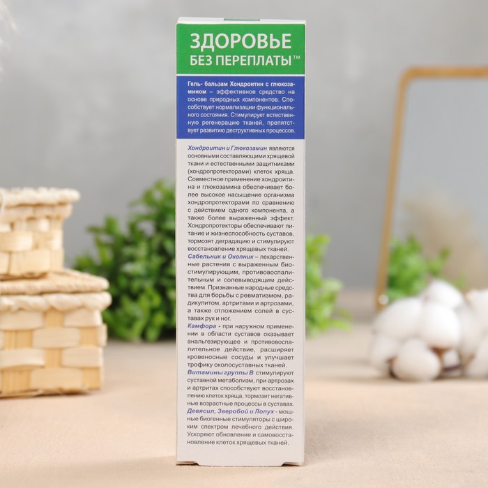 Состав: экстракт Окопника (Корень) 1%-ый, глицерин, микрокар DMP, цетиол С5, изигель DO, гидроксид натрия, микрокар IT (Катон CG), трилон Б (ЭДТА), ментол, камфора, масло эфирное эвкалипта, глюкозамин гидрохлорид, хондроитин сульфат (бычий), гидролизат коллагена, витамин В6, витамин В1, экстракт сабельника, экстракт лопуха, витанол, масло облепихи.