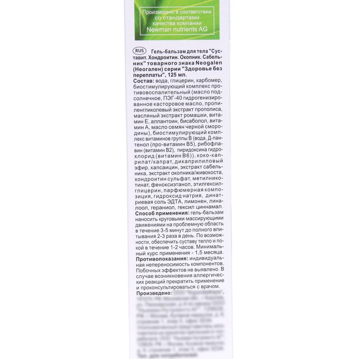 Способ применения: гель-бальзам наносить круговыми массирующими движениями на проблемную область в течение 3-5 минут до полного впитывания 2-3 раза в день. По возможности, обеспечить суставу тепло и покой в течение 1-2 часов. Минимальный курс применения - 1,5 месяца.