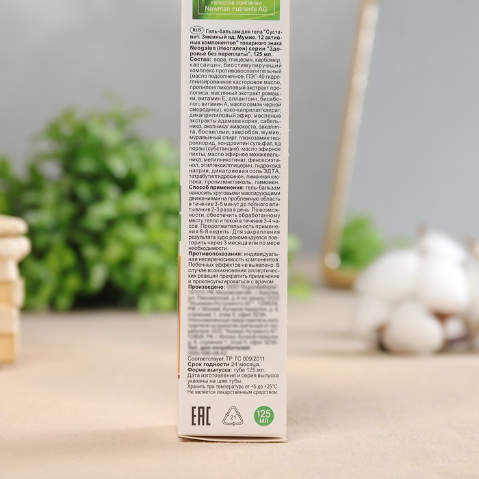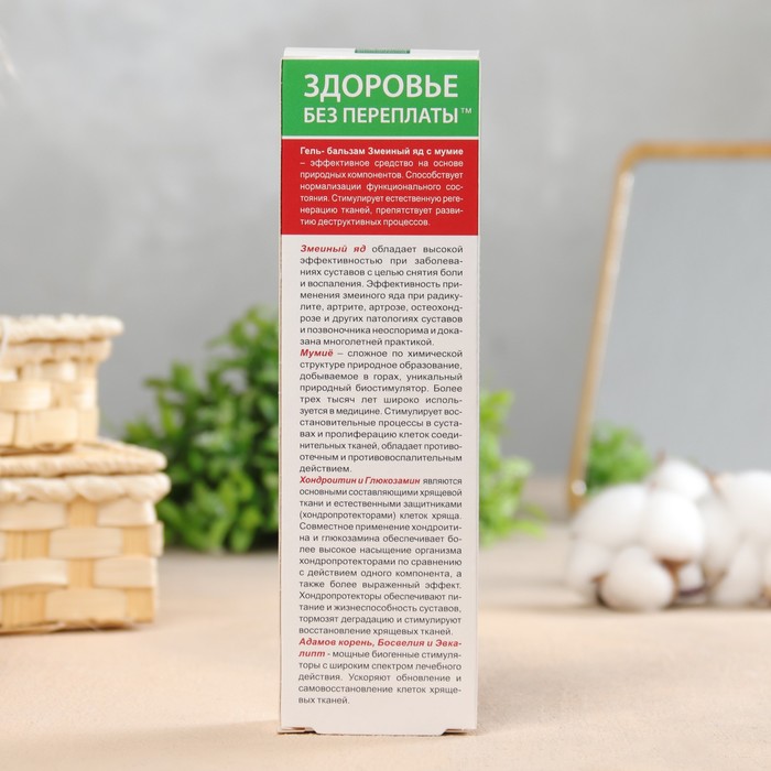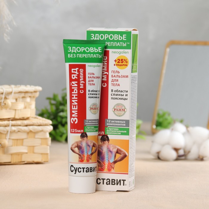 Гель-бальзам для тела "Суставит Змеиный яд" с мумием способствует нормализации функцио-ального состояния. Обеспечивает структурными элементами для актив-ного обновления и гибкости. Стимулирует естественную регенерацию тканей, препятствует развитию деструктивных процессов и старению. Действие и эффективность геля-бальзама обеспечены высокой биологической активностью его натуральных компонентов, обладающих выраженным положительным комплексным действием. Змеиный яд известен врачам с древности.