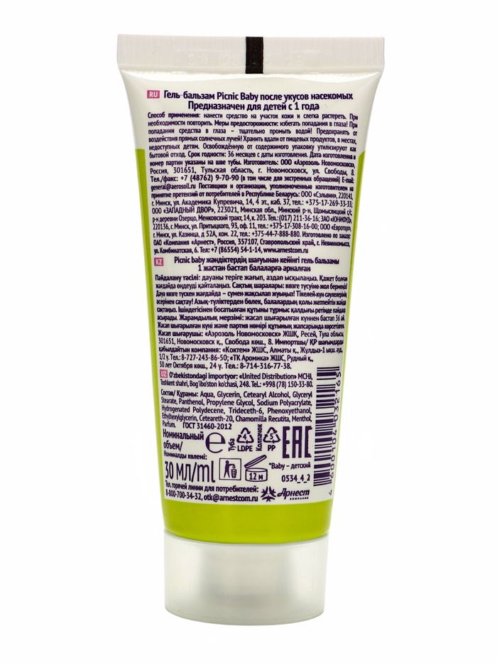 ОписаниеОписание: эффективное средство для успокоения раздражённой кожи после укусов насекомых. Крем быстро и равномерно наносится на кожу, имеет приятную консистенцию и мгновенно высыхает. Экстракты ромашки и алоэ ухаживают за кожей малыша, обеспечивая увлажнение и дополнительную защиту места укуса от бактерий. Современное безопасное действующее вещество не вызывает аллергии.Особенности: не рекомендуется применять детям до 1 года, беременным и кормящим женщинам. Подходит для нежной кожи ребенка. Содержит пантенол. Подходит для взрослых с чувствительной кожей.На водной основе, не сушит кожу. Быстро снимает зуд и раздражение. Легко наносится, быстро впитывается и не оставляет следов на одежде.Объем: 30 мл.Состав: ИР3535 (этил-3-[N-бутилацетамидо]-пропионат — 10%), вода деминерализованная, изобутан, стеариновая кислота, глицерил стеарат, ПЕГ-100 стеарат, пропиленгликоль, гидринол, пропан, бутан, крСоставИР3535 (этил-3-[N-бутилацетамидо]-пропионат — 10%), вода деминерализованная, изобутан, стеариновая кислота, глицерил стеарат, ПЕГ-100 стеарат, пропиленгликоль, гидринол, пропан, бутан, кремофор А6, изопропилпальмитат, триэтаноламин, отдушка, уротропин, экстракт алоэ вера, экстракт ромашки.