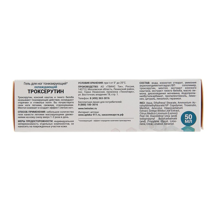 Состав: вода, изооктил стеарат, аммония акрилоилдиметилтаурат/ВП сополимер, троксерутин, ментол, экстракт конского каштана, экстракт гинкго билоба, масло лимона, диазолидинил мочевина, йодопропинилбутилкарбамат, пропиленгликоль, лимонен, цитраль, линалоол, гераниол.