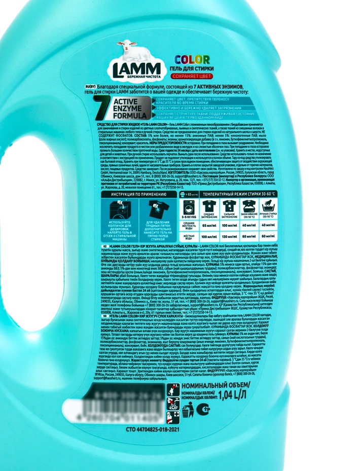 Гипоаллергенный гель для стирки Lamm Color с пониженным пенообразованием с биодобавками эффективно и бережно отстирывает цветные изделия из хлопчатобумажных, льняных и синтетических тканей, а также тканей из смешанных волокон в стиральных машинах любого типа и при ручной стирке.