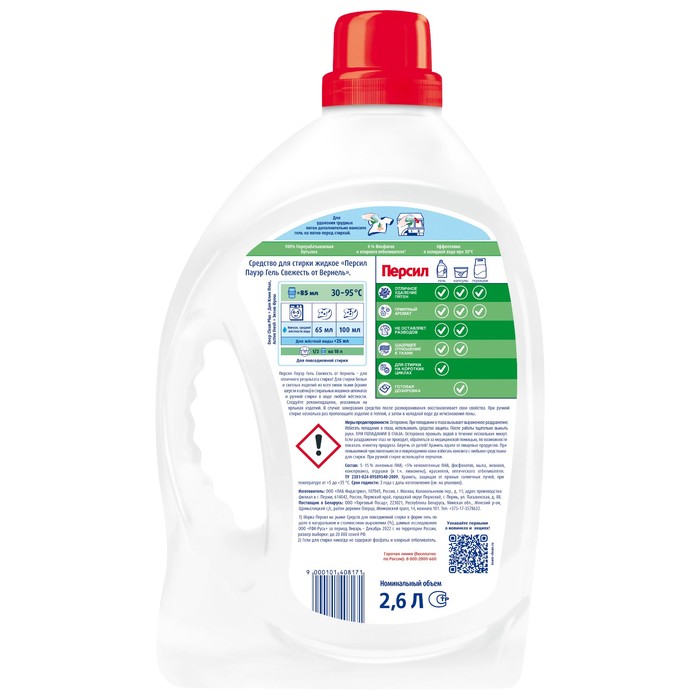 Состав:5–15 % анионных ПАВ; < 5 % неионогенных ПАВ, фосфонатов, мыла, энзимов, консерванта, отдушки (в т.ч. лимонена), красителя, оптического отбеливателя.