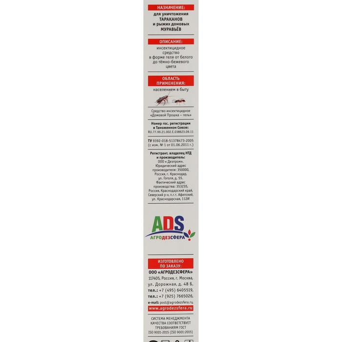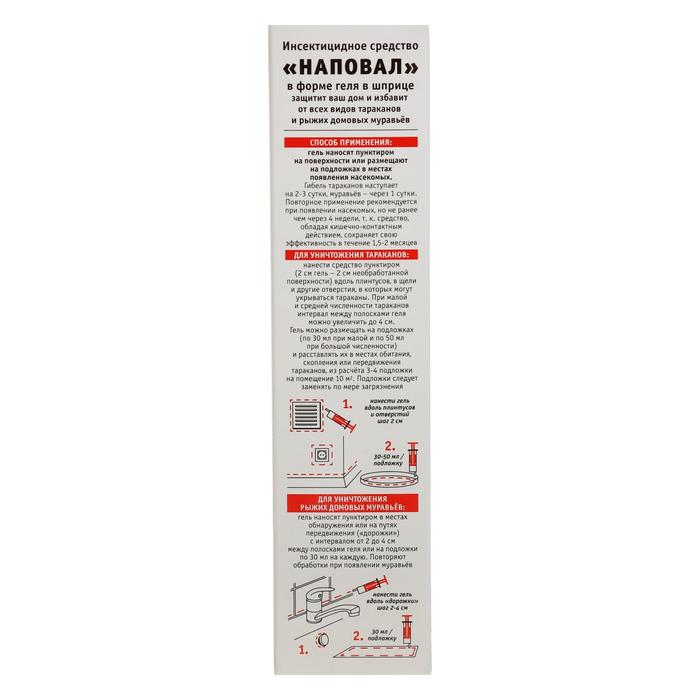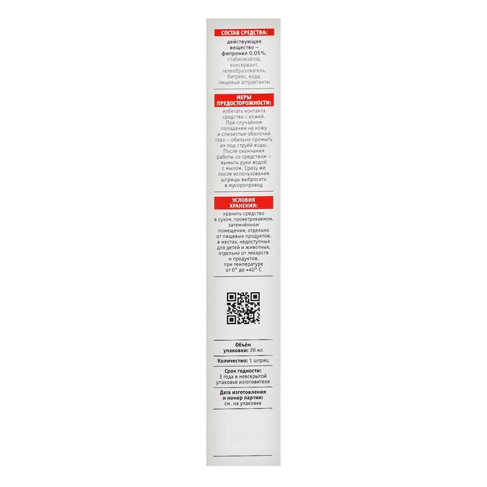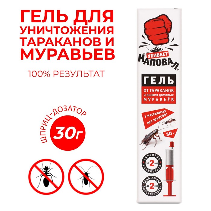 Инсектецидное средство в форме геля в шприце защитит ваш дом и избавит от всех видов тараканов и рыжих домовых муравьёв.Способ применения: гель наносят пунктиром на поверхности или размещают на подложках в местах появления насекомых. Гибелль тараканов наступает на 2-3 сутки, муравьёв - через 1 сутки. Повторное применение рекомендуется при появлении насекомых, но не ранее чем через 4 недели, т.к. средство обладая кишечно-контактным действием, сохраняет свою эффективность в течение 1,5-2 месяцев.Состав: фипронил 0,05%, стабилизатор, консервант, гелеобразователь, битрекс, вода, пищевые аттрактанты.