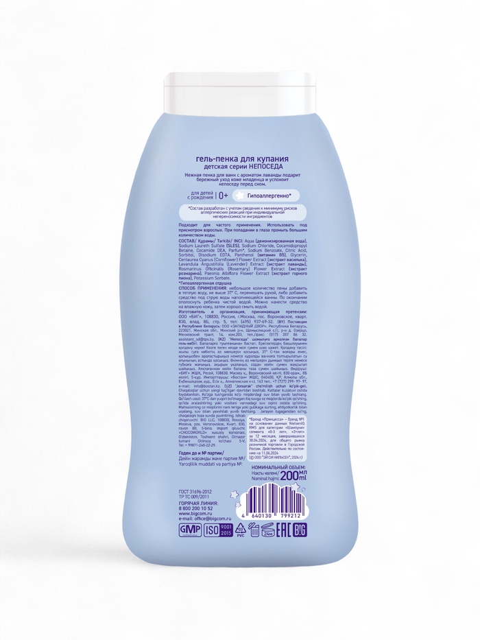 Благодаря Д-пантенолу и комплексу натуральных экстрактов лаванды и василька гель-пенка не только бережно очищает нежную кожу, но так же обеспечивает увлажнение и питание, способствует снятию ощущения сухости и раздражений. А нежный гипоаллергенный аромат успокоит кроху перед сном. Состав разработан с учетом сведения к минимуму рисков аллергических реакций при индивидуальной непереносимости ингредиентов.
