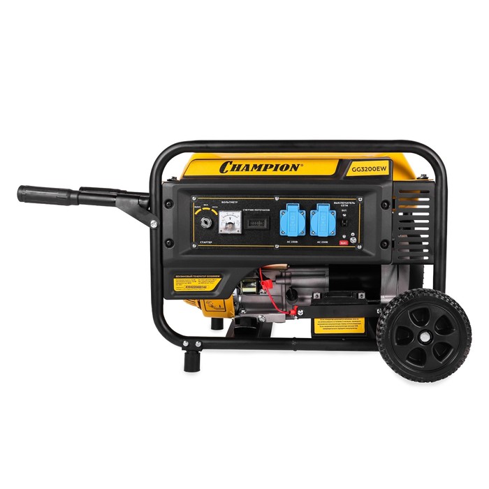 Генератор бензиновый CHAMPION GG3200EW, 4Т, 3.5 кВт, 220 В, электростарт, колеса, счетчик обеспечит вас электроэнергией вдали от стационарных источников и на период проведения аварийных работ. Благодаря небольшим размерам устройство можно перенести в любое удобное для вас место. Ток вырабатывается посредством преобразования механической энергии двигателя внутреннего сгорания. Запаса топлива и мощности достаточно, чтобы обеспечить бесперебойную подачу электричества в течение нескольких часов.