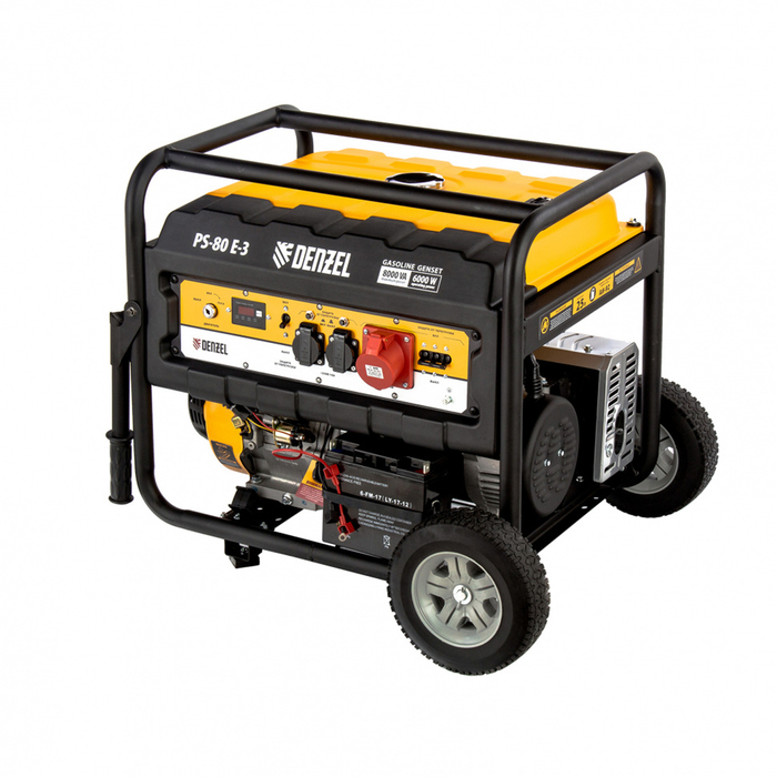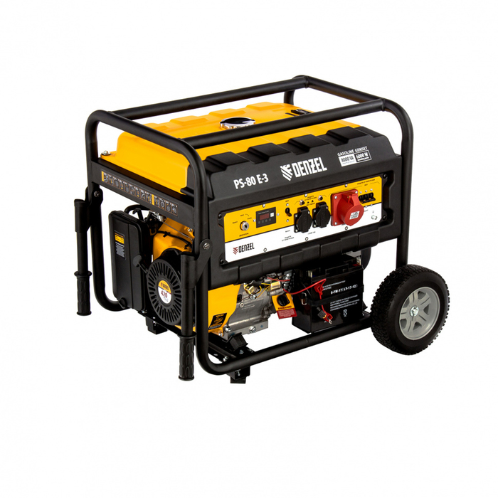 Генератор бензиновый Denzel PS 80 E-3 946954, 4Т, 6000 Вт, 230/400 В, 25 л, АКК/электростарт обеспечит вас электроэнергией вдали от стационарных источников и на период проведения аварийных работ. Благодаря небольшим размерам устройство можно перенести в любое удобное для вас место. Ток вырабатывается посредством преобразования механической энергии двигателя внутреннего сгорания. Запаса топлива и мощности достаточно, чтобы обеспечить бесперебойную подачу электричества в течение нескольких часов.