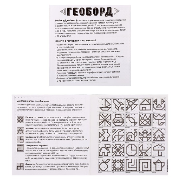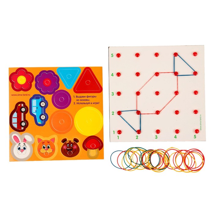Геоборд — это специальная доска для конструирования различных изображений с помощью равноудалённых друг от друга штырьков и резиночек. Их малышу предстоит нанизывать на выпуклые элементы и создавать таким образом разнообразные фигуры.