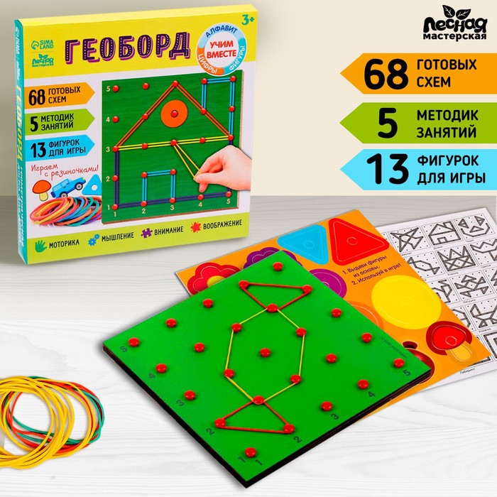 Геоборд — это специальная доска для конструирования различных изображений с помощью равноудалённых друг от друга штырьков и резиночек. Их малышу предстоит нанизывать на выпуклые элементы и создавать таким образом разнообразные фигуры.