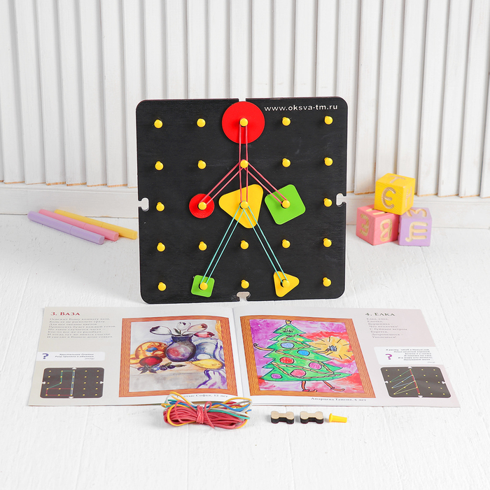 Развивающая игра «Математический планшет» состоит из деревянной квадратной основы с 25 пластмассовыми штырьками, комплекта разноцветных резинок, набора деревянных геометрических (6 шт.: круг, квадрат, треугольник в двух размерах), специальных скреп для соединения нескольких планшетов в одно большое игровое поле и красочного альбома с методическими рекомендациями, заданиями, стишками и загадками.