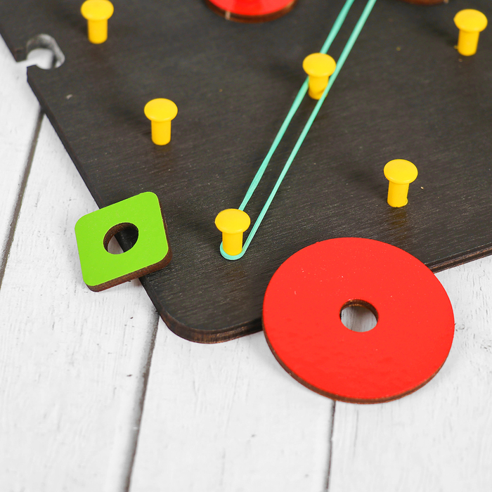 Мелкая моторика и координация, ловкость рук и пальцев (а это минимум, необходимый для развития речи!) совершенствуются в процессе натягивания резинок на штырьки. Попробуйте сами, и вы убедитесь, что это не так легко, как кажется!