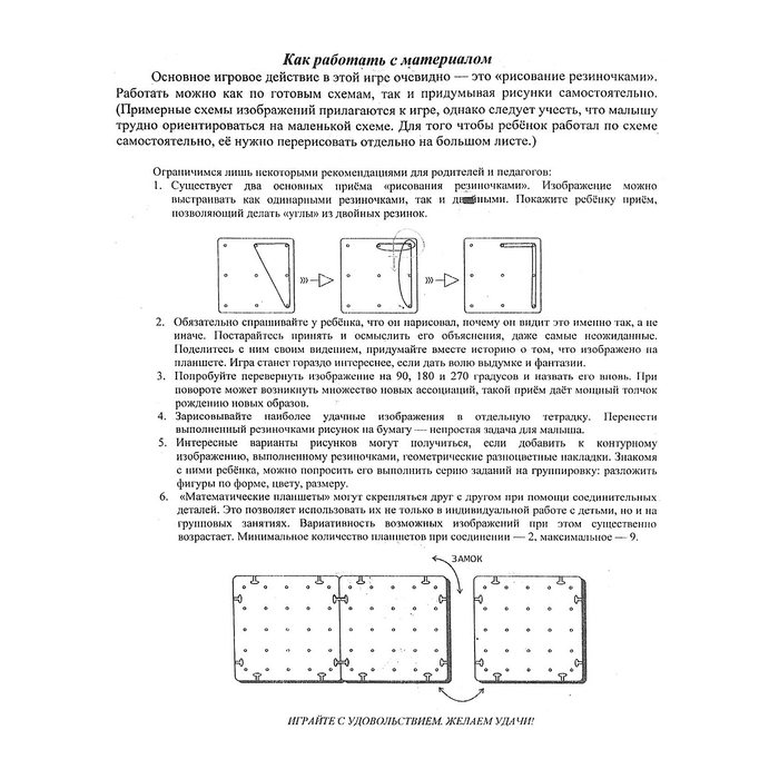 «Геометрический планшет» воздействует на сенсорное восприятие, помогает осваивать абстрактные образы через физическое, тактильное ощущение. С его помощью удобно изучать цифры и буквы. Играя, дети натягивают и многократно проводят пальчиками по резинкам, изображающим цифру или букву, и лучше запоминают её образ и название.