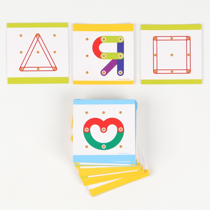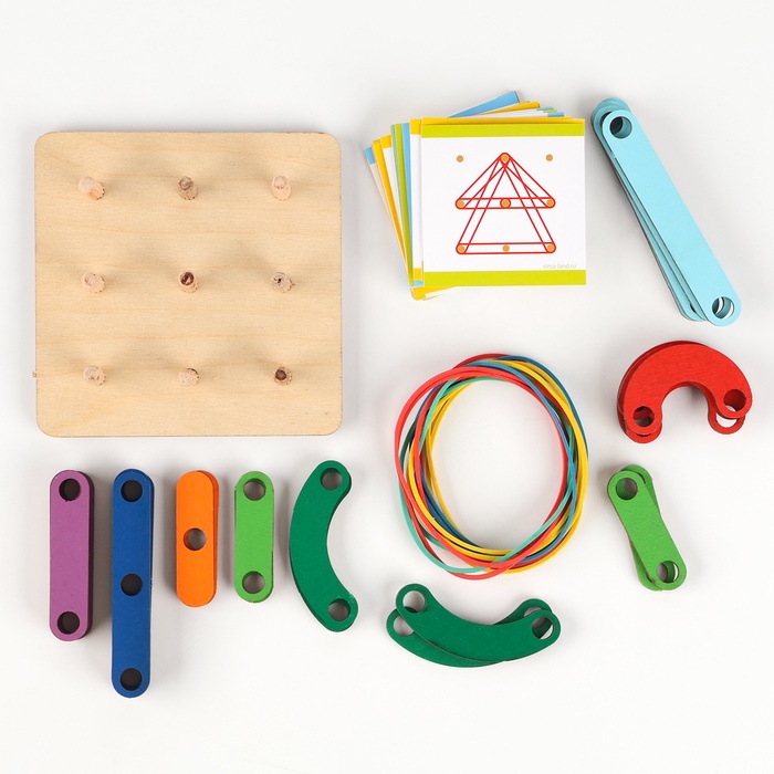 Задача ребёнка – повторите изображение с карточки. Со временем для усложнения задания деревянные палочки можно заменить на резинке. Геоборд поможет ребёнку легко освоить буквы и цифры.