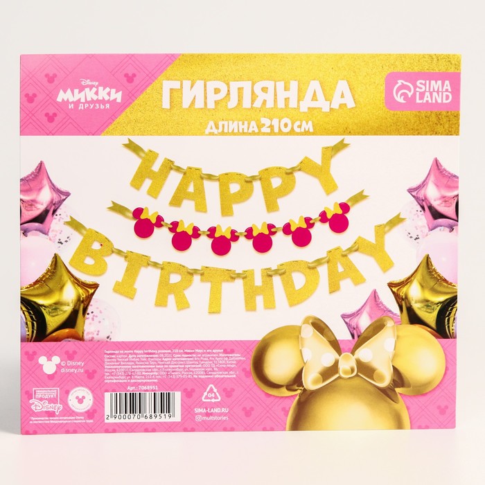 Гирлянда на ленте "С днем рождения", длина 210 см, Минни Маус