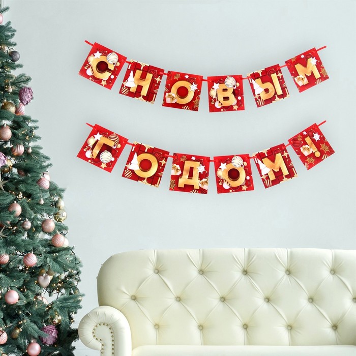 Растяжка - гирлянда "С Новым годом" - красивый и стильный атрибут праздничного оформления. Бумажная гирлянда, выполненная из плотного картона (200 грамм), будет отлично смотреться на кадрах в фотозоне или других локациях. Картонная гирлянда выполнена в современном стиле и подходит под различную тематику оформления праздника. Вывеска регулируется по длине и может использоваться в один или два ряда.