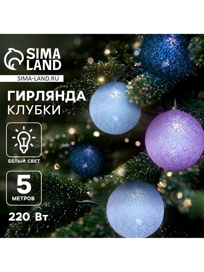 Гирлянда «Нить» 5 м с насадками «Клубки серо-розовые», IP20, прозрачная нить, 20 LED, свечение белое, 220 В