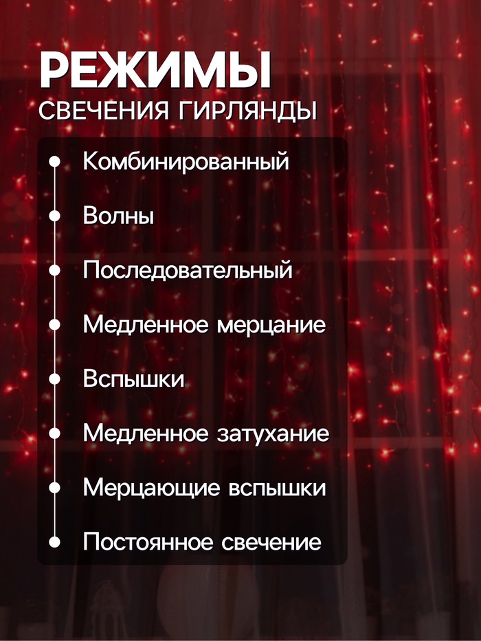 Гирлянда «Занавес» 2×1.5 м, IP20, прозрачная нить, 360 LED, свечение красное, 8 режимов, 220 В
