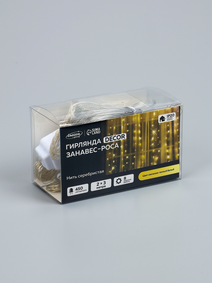 Гирлянда «Занавес» 2×3 м роса, IP20, серебристая нить, 450 LED, свечение тёплое белое, 8 режимов, 220 В