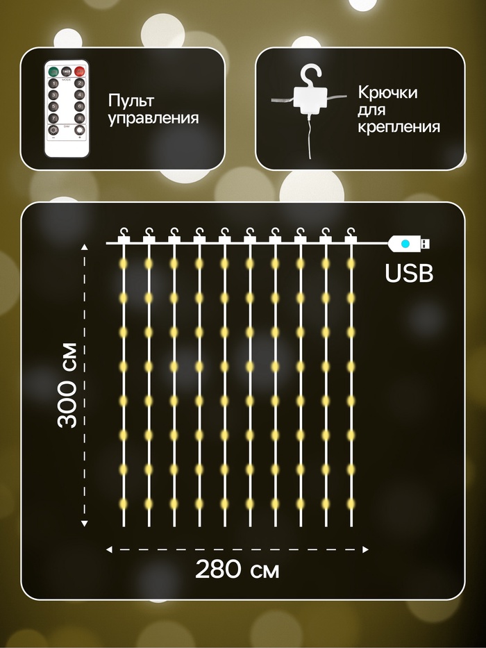 Гирлянда «Занавес» 2.8 × 3 м роса на крючках, с пультом, IP20, серебристая нить, 300 LED, свечение тёплое белое, 8 режимов, USB