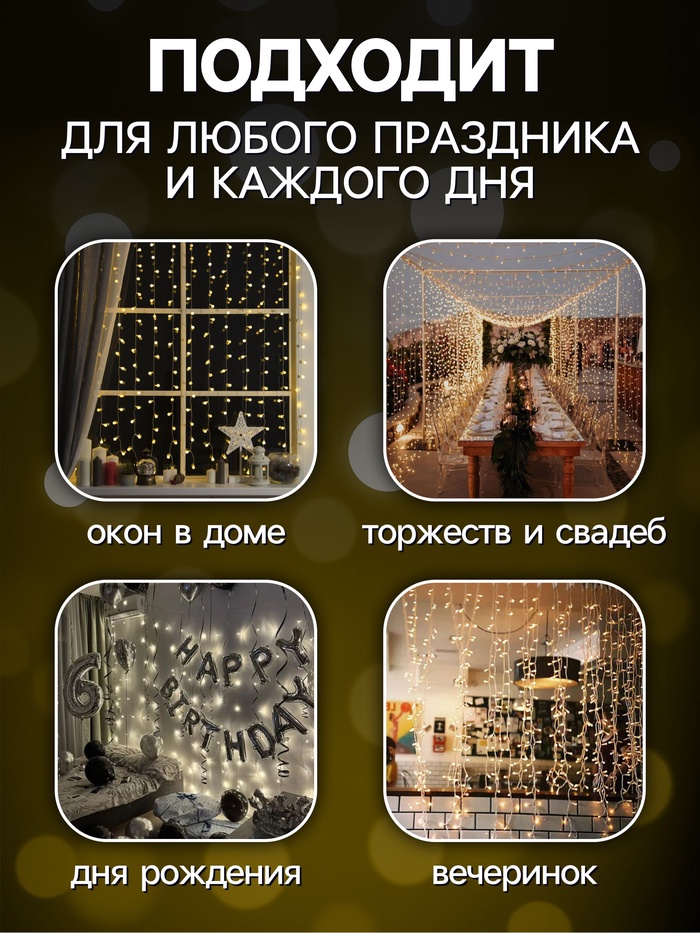 Также такой вид декора часто используется на праздниках, свадьбах и других мероприятиях для создания атмосферного освещения. Его закрепляют на стенах, проемах, дверях или даже используют для создания арки или декоративной стены. Гирлянда занавес является универсальным декоративным элементом, который придаст праздничности и стиля.